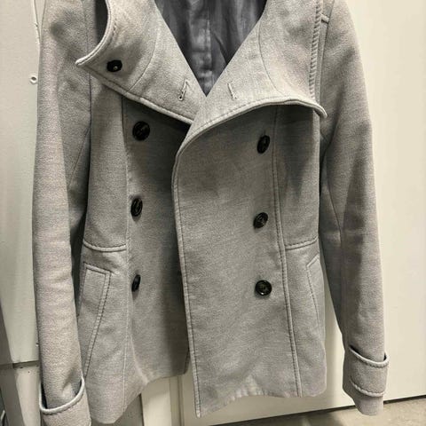 GråBlå med två stora fickor , polyester fuskpäls , tillverkad i Finland. En stor S . Mått axelbredd 63 cm , bredd vid fickor 50 cm . Längd 119 cm, Axelvaddar . Tidigt 90/ tal . Katt finns i hemmet