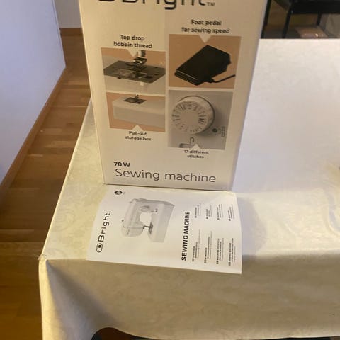 Symaskin i svart färg i smidig mindre storlek med tillhörande fotpedal och strömadapter. Maskinen har grundläggande funktioner för sömnad och är kompakt i storlek.