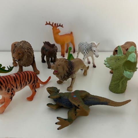 Säljer ett paket med plastfigurer: dinosaurier och vilda djur.