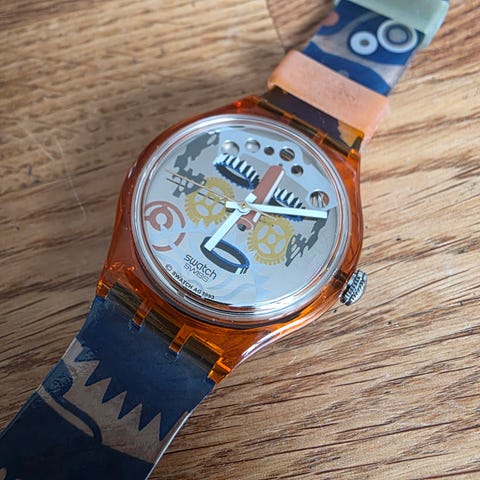 Lite mer info om klockan: I början av 1990-talet så var Swatch precis som nu egentligen (tack vare Moonswatch) det hetaste inom klockvärlden, inte minst på wall street och inom finansvärlden. Nicolas G Hayek (VD då som nu för Swatch Group) lanserade 1993 denna extremt vågade modell som än i dag är den enda klocka som Swatch låtit tillverka i platina. Han valde att lansera den på NYMEX, dvs börsen i New York där man handlar med råvaror som till exempel ädelmetaller som platina och guld. Den blev snabbt en snackis då man ansågs ha gjort något omöjligt. Det vill säga en platinaklocka som kostade en bråkdel så mycket som andra klockor i samma material. Priset var ca 1600 amerikanska dollar vilket då var ca 20 gånger dyrare än vanliga Swatchklockor men som sagt, fortfarande betydligt billigare än klockor från de mer traditionella schweiziska tillverkarnas motsvarigheter.