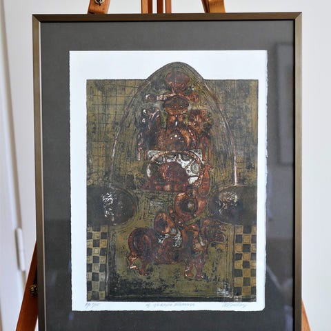 Gustav Torko oljemålning från 1987 med motiv av ett hus vid vatten. Målningen är inramad och har en realistisk stil med detaljer i brunt, grått och svart. Passar för väggdekoration i hem eller kontor. Mått 108x88 cm