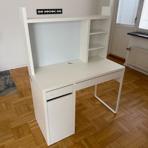 IKEA skrivbord i vitt med enkel design. Bordsskivan har skador med hål och märken. Passar för användning som arbets- eller skrivbord i hem eller kontor.