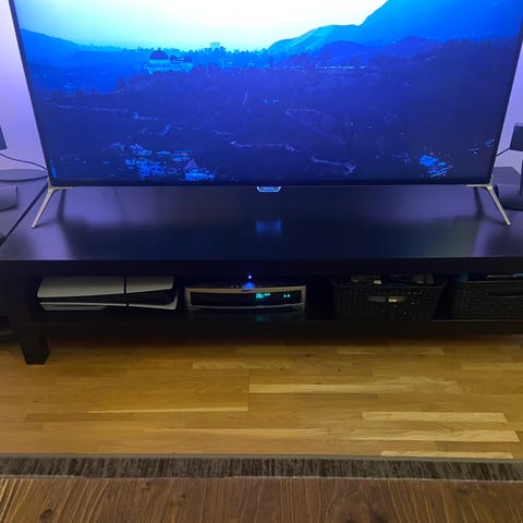 Målad bänk använd som tv bänk.