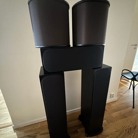 Yamaha RX-V663 hemmabioförstärkare med tillhörande KEF högtalarsystem bestående av två vägghängdahögtalare fram och bak, en centerhögtalare och en subwofer Högtalarna är svarta och avsedda för hemmabioanvändning.