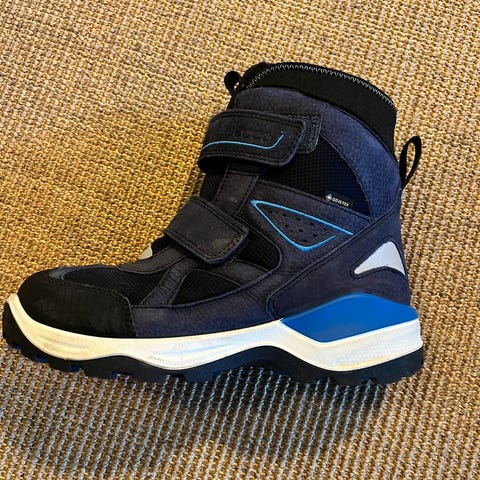 ECCO vinterkängor unisex i storlek 38, svarta till färgen. Skorna har tre kardborreband för justerbar passform och är designade för att ge stöd och komfort för barnets fötter.