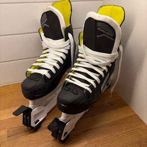CCM 3800 ishockeyskridskor i storlek 40 med svart färg. Skridskorna är avsedda för ishockey och har en klassisk design med vita snören och vita skridskobladsramar. Passar användare som söker standard ishockeyskridskor i denna storlek och färg.