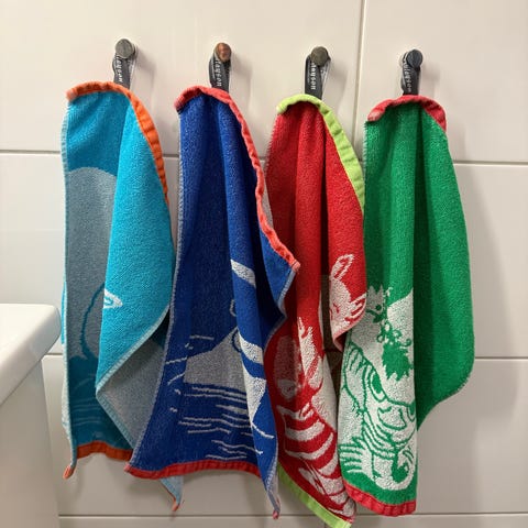 Lanzarote strandhanddukar med ödlemotiv i blå och rosa