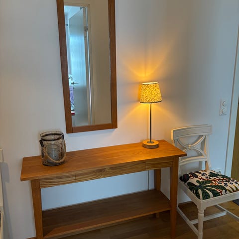 Hallmöbel från 60-talet i mycket bra skick. Spegeln är 122 hög och 92cm bred. Byrån är 39cm djup, 110cm bred och 47cm hög. Lampan är också till salu.