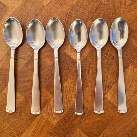 Fyra kaffeskedar, Rosenholm, äkta silver. Lite använda men regelbundet pustade. Design Jacob Ängman. Längd 12 cm. Totalvikt 57 gram