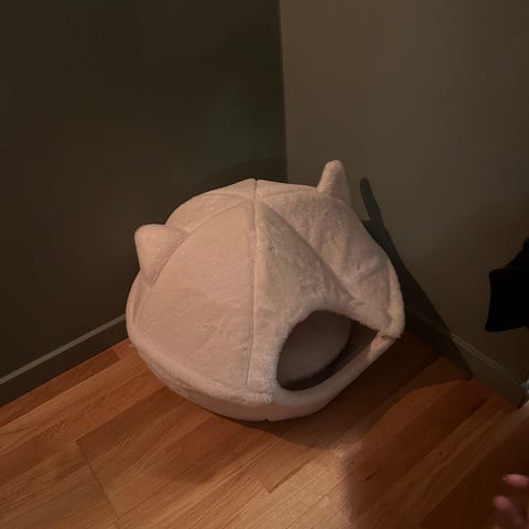 Zooland Kattbädd i grått filttyg med en rund öppning och mjuk vit dyna inuti. Passar för katter och erbjuder en avskild plats för vila.
