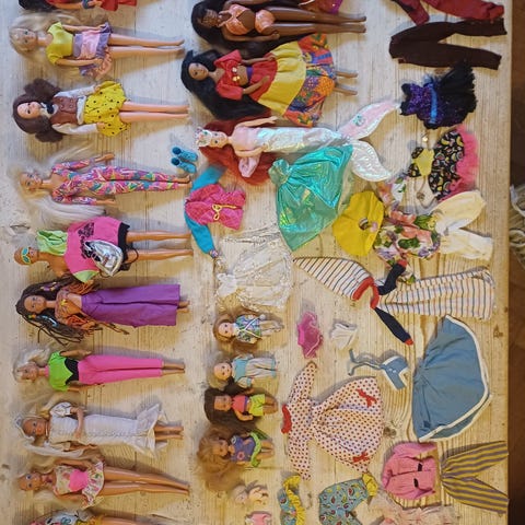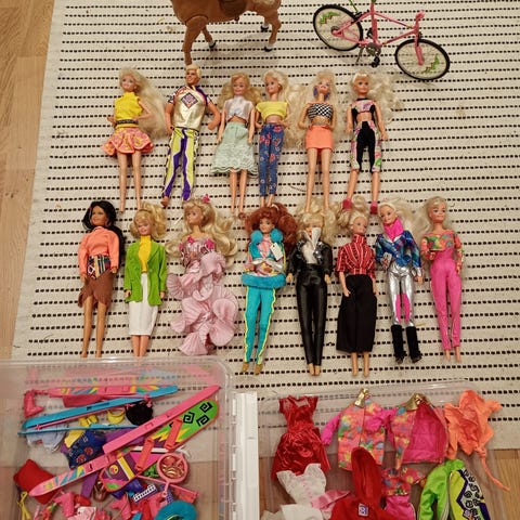 Barbie dockor i olika storlekar och kläder, inklusive en brudklänning, sommaroutfit, och casual kläder. Dockorna är tillverkade i plast och är avsedda för lek och samling.