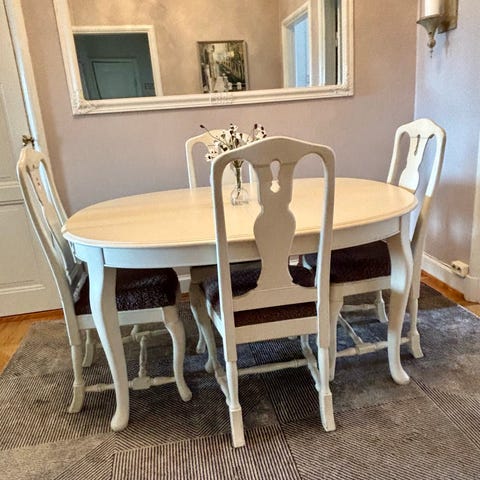 Mycket vacker matsalsgrupp med 6 stolar och ett bord med 2 iläggsskivor