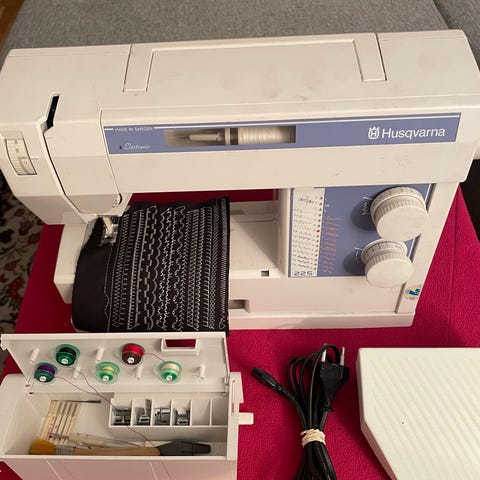 Husqvarna Viking Prelude 340 symaskin med flera sömnadsfunktioner och tillbehör. Maskinen är utrustad med olika sömmar och justerbara inställningar för olika typer av sömnadsprojekt. Ny servad fungerar jättebra