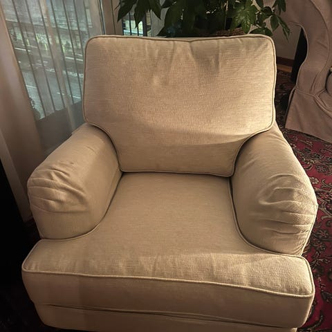 Fåtöljen är lagad på baksidan, enligt bild. Fåtölj och fotpall säljes ej separat.