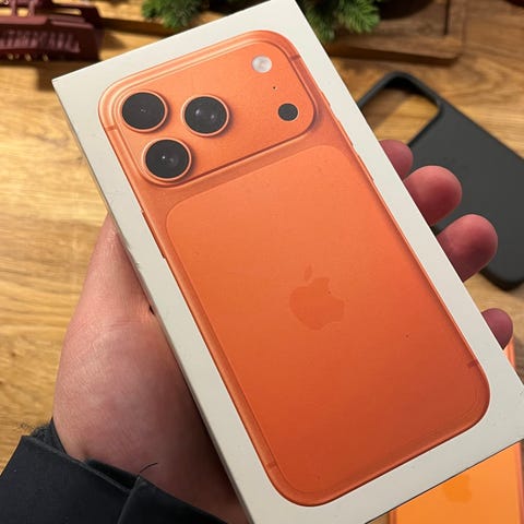 Apple iPhone 17 Pro mobiltelefon med 256 GB lagringsutrymme. Enhetens färg är orange.