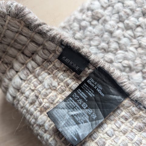 Superfin matta från H&M Home i 70% ull och 30% bomull. Mönstrad i blåa, gröna och vita färger med olika ”höjd” och struktur på garnet. Tjock och gosig, perfekt bredvid sängen eller på golvet i ett barnrum. Knappt använd då storleken blev fel för rummet. Inga fläckar eller annat att anmärka på. Storlek 80x140 cm. Hittar den inte till salu längre men tror den kostade 800-1000 kr. Säljes för 400 kr eller högstbjudande. Finns att hämta vid Mariatorget.
