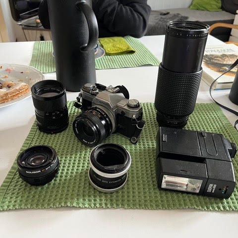 Canon A-1 Canon 50mm f1.4 FDn Chinon CE-4 Chinon 28mm f2.8 Auto Multi-Coated