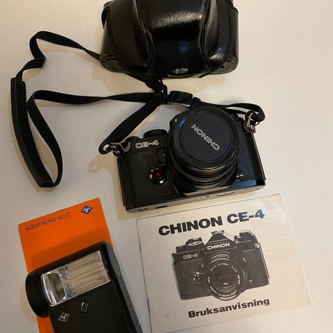 Chinon CM-4s Chinon 50mm f1.9 Auto, Problem och fynd, Spegelmekanismen låter torrt, mycket damm och svamp inuti sökaren. Främre logotypplattan är lös. Bländarbladen är mycket oljiga och fastnade.