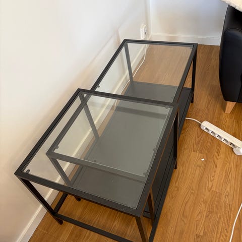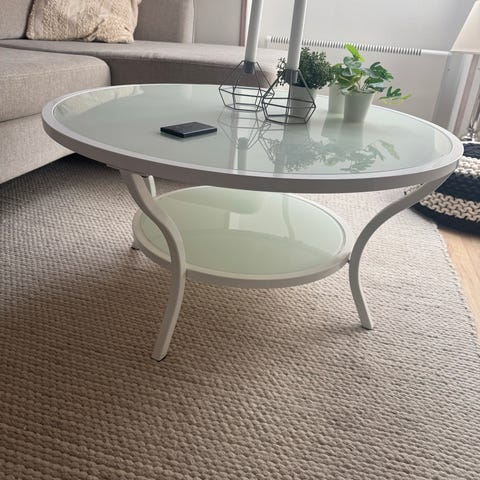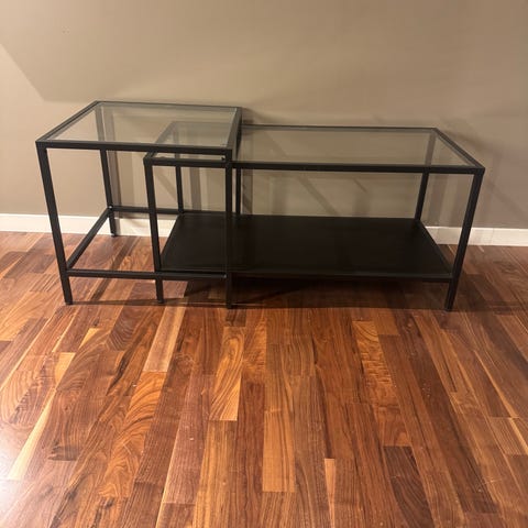 Det är ett tvådelat klassiskt vardagsrumsbord med glasskiva och botten perfekt för förvaring.