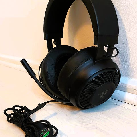 Razer hörlurar i rosa färg med vadderade öronkåpor och justerbar huvudbygel.