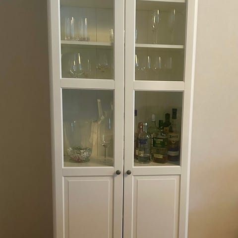 Vitrindörrar, justerbara hyllor, låda samt inbyggd (fungerande)belysning.