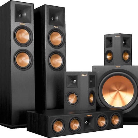 Marantz förstärkare med flera anslutningar för ljud- och bildutrustning. Systemet inkluderar Elac högtalare med inbyggd subwoofer. Komplett ljudanläggning med fjärrkontroller och olika ingångar för anslutning till externa enheter.