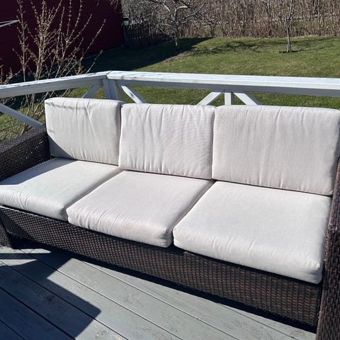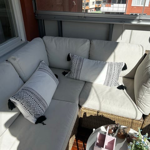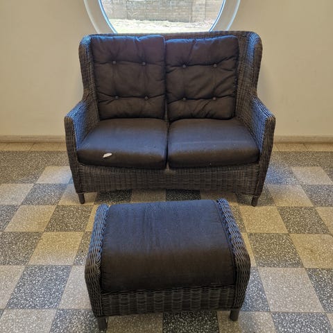 Utemöbel i rotting bestående av en hörnsoffa. Möbeln har en brun färg och är tillverkad i syntetiskt rottingmaterial. Passar för utomhusbruk och ger sittplats för flera personer.