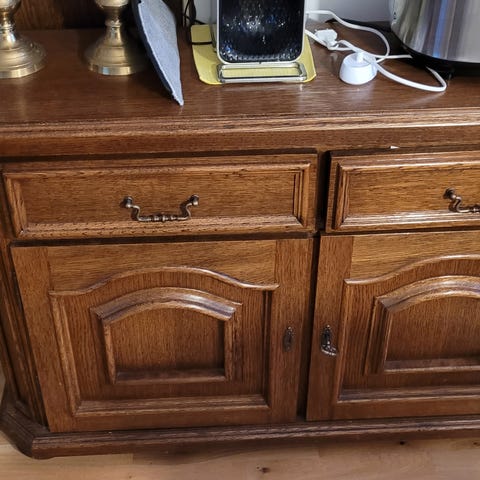 Skänk med bra förvaring i två skåp som rymmer köksmaskiner. Skåpens mått: höjd 64 cm, 35 cm bred och 34 cm djup, hyllan i skåpet går åt höja och sänkas eller ta bort. Fyra lådor som är 32 cm breda, 28,5 cm djup.