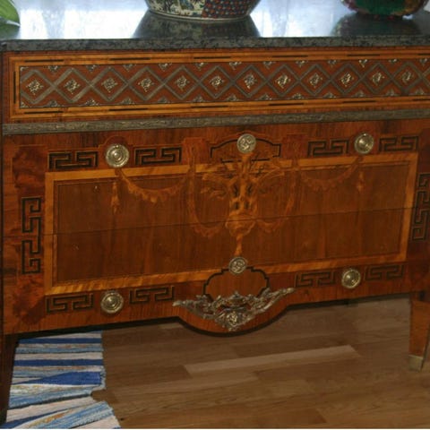 Vacker gammal byrå i gustaviansk stil med stor spegel.
