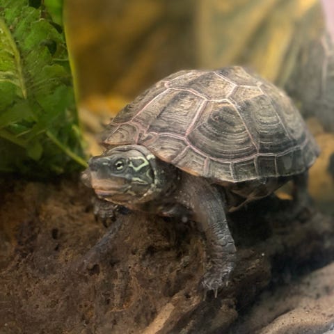 Sköldpaddan är ca 7 cm över skalet, frisk, pigg och väldigt tam – kryper själv upp i handen när det är dags för mat.