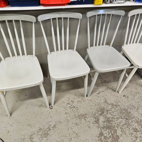 Säljer två klassiska pinnstolar i nordisk stil med rundad ryggbricka och svarvade pinnar. Stolarna är lätta men stabila, med fanérade sitsar – en vanlig lösning på stolar från 1950–70-talet. Äldre kontrollstämplar finns under sitsarna.