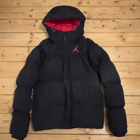 Nike Jacka i svart färg, storlek S, tillverkad i polyester. Jackan är avsedd för herrar och är en del av Nikes ytterkläder. Den har huva och dragkedjeförsedda fickor framtill.