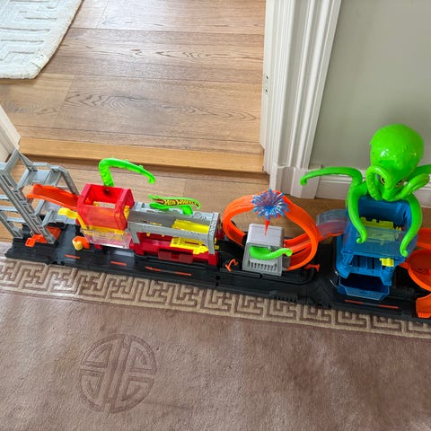 Hot Wheels Ultimate Garage leksaksgarage med flera nivåer och ramper för bilbanor. Inkluderar en dinosauriefigur som en del av designen. Färgerna är främst orange, blå och grå. Lämplig för barn som gillar bilbanor och lek med små bilar.