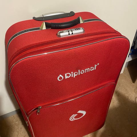 Stor resväska av tyg i fint skick! två hjul och ställbart handtag. Höjd 71 cm. Bredd 47 cm. Djup 25 cm
