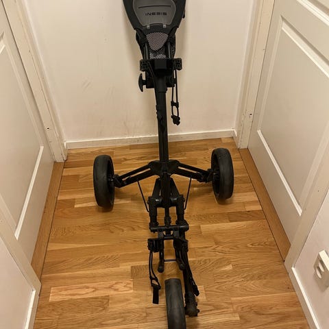 Fin golfvagn i mycket bra skick. Köptes i somras och har använts kanske 10 gånger Max. Medföljer oöppnad paraplyhållare.