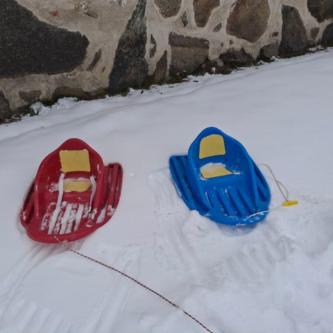 Åkmadrass, en mjuk pulka, från Clas Ohlsson. Snöret har lite reflexmaterial på sig