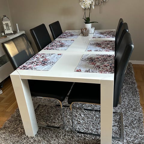 Matgrupp med runt bord och fyra stolar i vitt