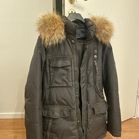 Svart dun parkas med avtagbar huva med äkta päls bräm, från Hollies.