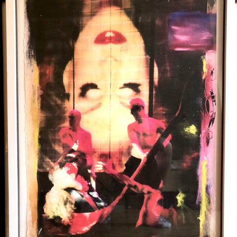 Målning föreställande en grupp personer på ett café med röd markis och olika klädda figurer. Tavlan är inramad och visar en social scen med människor i olika positioner och en liten hund. Färgerna är levande med inslag av rött, blått, grönt och svart.