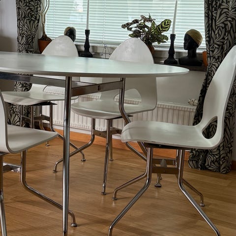 4 trästolar med sittdynor från Ellos medföljer.