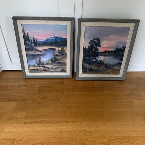 Tavla med landskapsmotiv i akvarell, inramad i vit ram. Två olika motiv med natur- och skogstema, passar för väggdekoration i hem eller kontor.