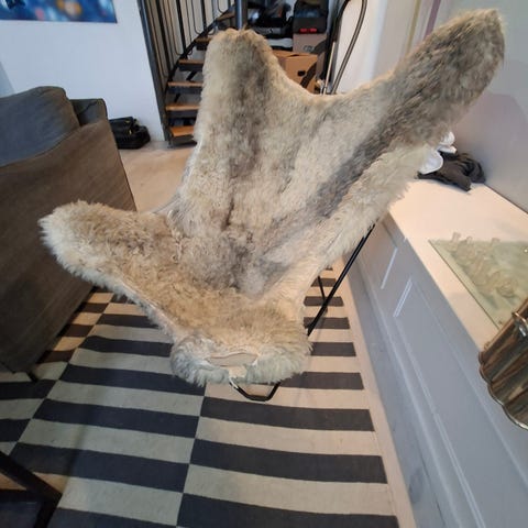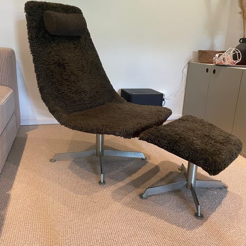 Fin fåtölj med nackkudde och fotpall i lurvigt brunt fårskinn.