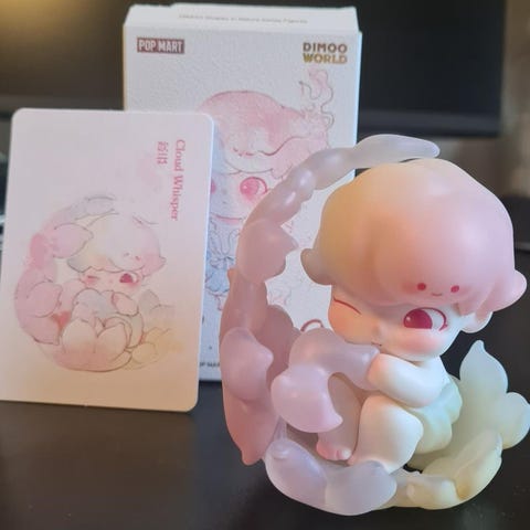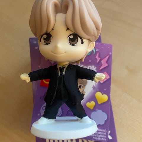 TinyTAN SUGA figur inspirerad av BTS, med detaljer som blått hår, svart pannband och vit jacka. Figuren står på en gul bas och är en samlarartikel.