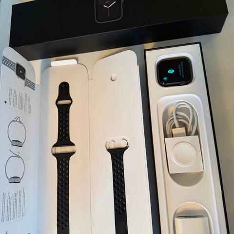 Apple Watch Nike+ series 3 smartklocka med svart sportarmband och laddare.