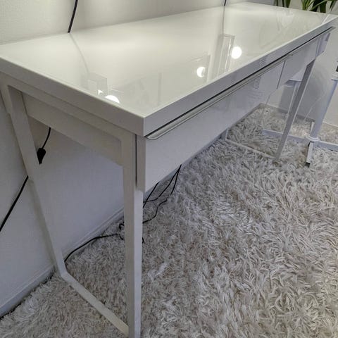 IKEA Bestå Burs skrivbord. Passar mycket bra som sminkbord eller för nagelarbete p.g.a. att det är ganska smalt, 40 cm, och det ligger en frostad glasskiva på. Två stora lådor. Färg: vit, högglans. Kan stå mitt i rummet eftersom även baksidan är ytbehandlad. Mycket bra skick! Se bilder!