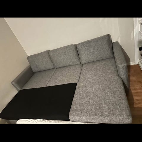 Mio soffa i grått tyg. Soffan har en hörnform och erbjuder förvaring under sittdelen. Kan även användas som bäddsoffa med utdragbar sovyta.