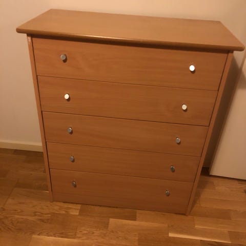 Vit nymålad stabil byrå med 3 stycken större lådor och 2 stycken mindre lådor i gott använt skick.