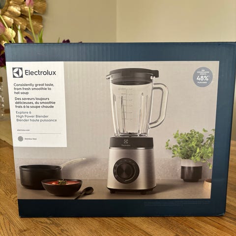 Electrolux blender med svart bas och glasbehållare. Utrustad med ett roterande vred för inställning av hastighet. Blendern har en robust kniv i glasbehållaren för mixning av ingredienser.