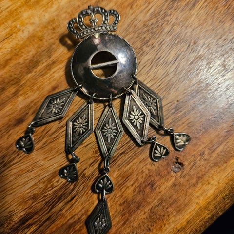 Dräktbrosch Regina, sedvanlig metall-legering, nysilver utan stämpel. Bredd 28 mm, längd 70 mm. Används till Gagnefs folkdräkt, även Leksand och Åhls dräkt mm.