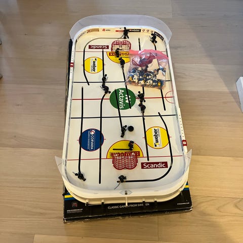 Allstar bordshockeyspel i vitt. Spelet är utformat för inomhusbruk och har en klassisk hockeybana med spelare i olika färger. Inkluderar puckar och spelare för att simulera hockeymatch.